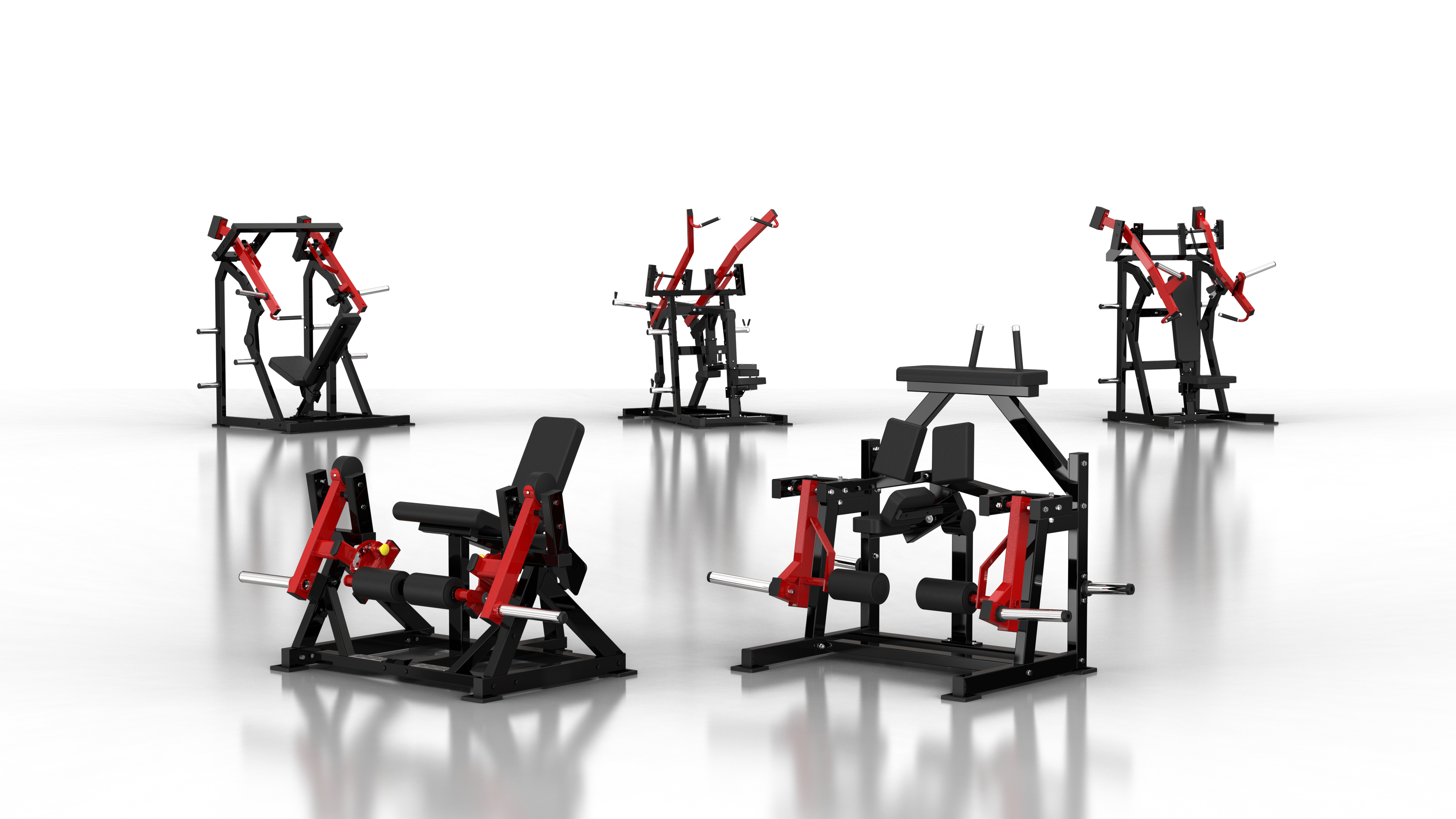 Seated leg extension, Incline pectoral fly, Arm down back muscle training, Seated calf machine, Reloaded iso flat press, Push shoulder trainer, Iso-lateral front lat pulldown, Abdominal oblique crunch...
